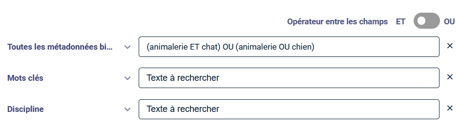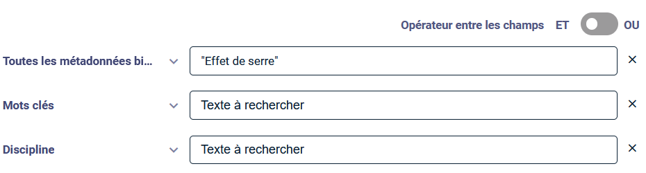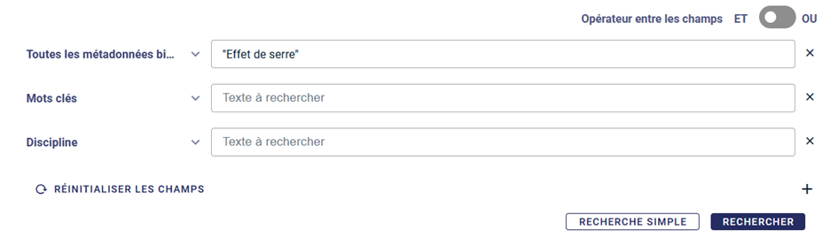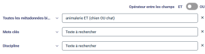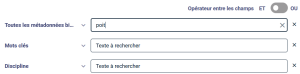 Dans la barre de recherche avancée, vous pouvez modifier l’opérateur booléen qui articule ente eux les champs de recherche à l'aide du bouton dédié .